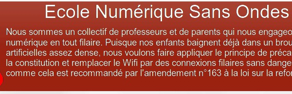 L'EHS est une urgence humanitaire https://www.robindestoits.org/Petition-l-EHS-Urgence-Humanitaire_a3433.html Soutenez les pétitions contre les antennes-relais. Pétition pour des lieux de Vie sans ondes. de la téléphonie mobile et du Wi-fi Comment désactiver le wifi ?Comment désactiver le Wifi (Wi-Fi) chez soi :