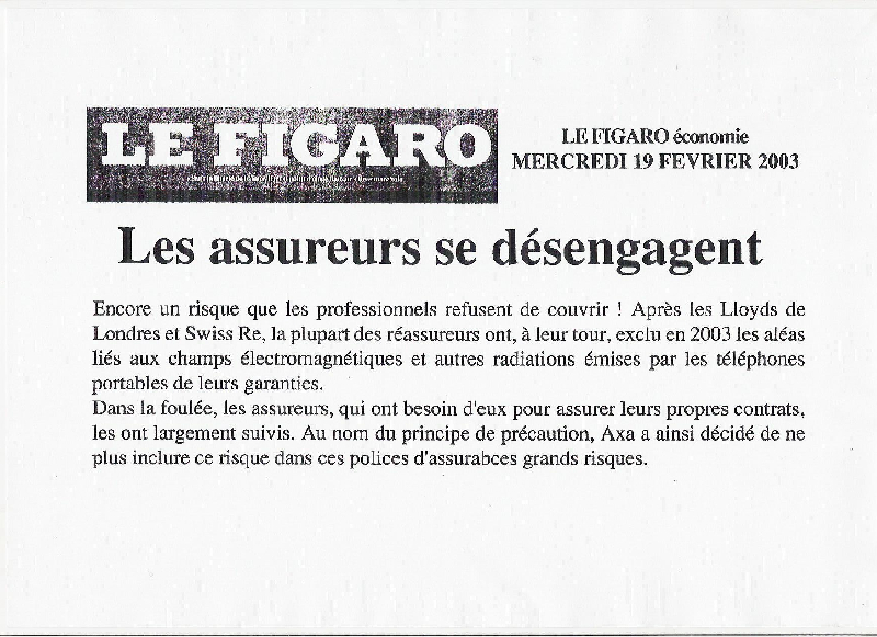 En 2003, les principales compagnies mondiales de réassurance - en particulier la LLoyds, la Swiss de Ré, Allianz... - déclarent publiquement qu'elles ne couvrent plus la téléphonie mobile.