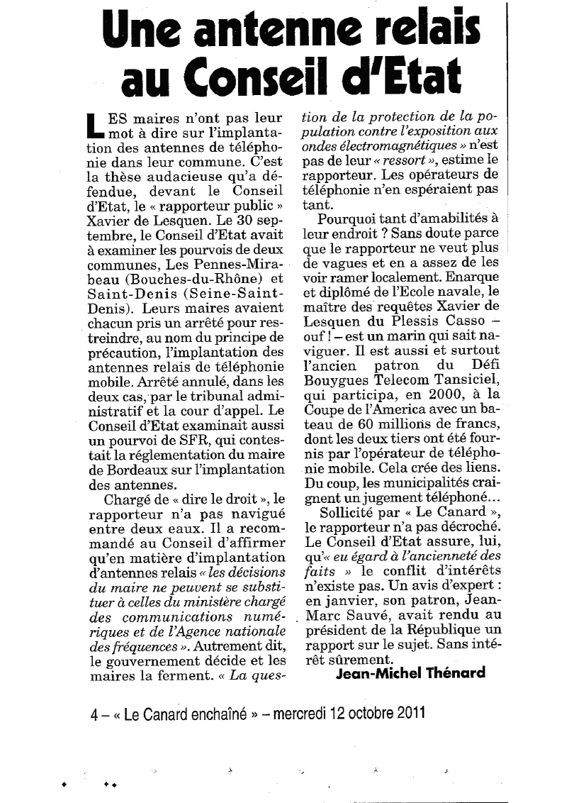 Une antenne relais au Conseil d'Etat - Le Canard Enchaîné - 12/10/2011
