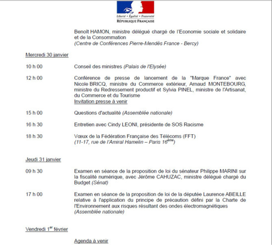 Fleur Pellerin est accusée par certains d'être un relais des opérateurs de téléphonie mobile au sein du gouvernement, leur VRP, en quelque sorte. Son agenda accessible ici : http://proxy-pubminefi.diffusion.finances.gouv.fr/pub/document/18/14086.pdf nous apprend que le 30 janvier à 18h30, la veille de l'examen en séance publique de la proposition de loi de Laurence Abeille sur la limitation des seuil d'exposition des antennes-relais de téléphonie mobile, elle avait justement rendez-vous dans le 16ème arrondissement de Paris pour les "Voeux de la Fédération française des Télécoms".